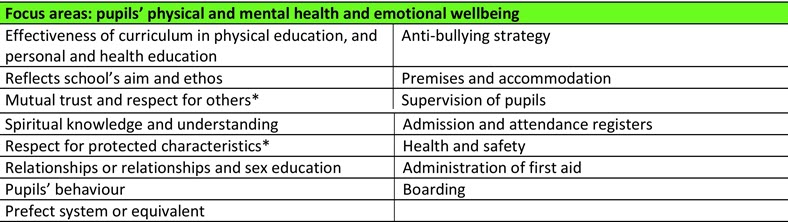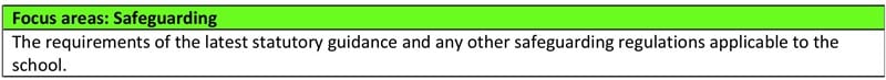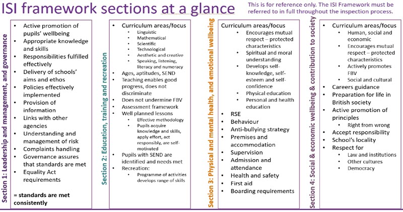 21. The table above overviews Sections 1 – 4 of the ISI framework and focus areas. The inspection of safeguarding follows the requirements of the most recent statutory guidance.