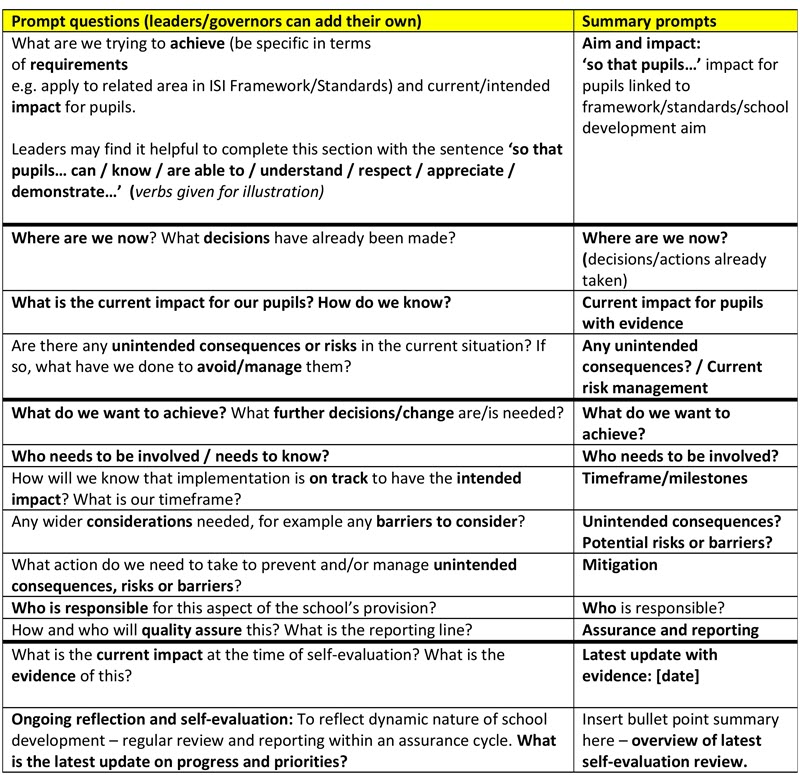 Answer: Schools may adapt this approach to fit in with their existing development planning cycle, which will include some element of self-review to identify priorities. Development planning is, by nature, future-orientated, and the self-evaluation process reflects the previous and current situation. This process is captured in the structure of the summary prompt table included in this guidance. In using this approach with focus areas aligned to the Standards, proprietors and leaders will be supported to review the extent to which they meet their responsibilities to the regulator. This approach allows other priorities for the school to be included in development planning.