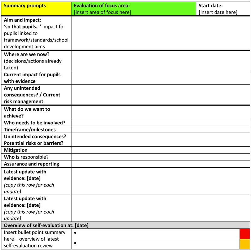 28. If leaders and governors choose to use the summary prompt table below, it can be used for each area of focus. It can form the basis for self-evaluation of a focus area and contribute to the whole school self-evaluation process.