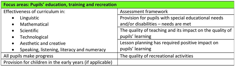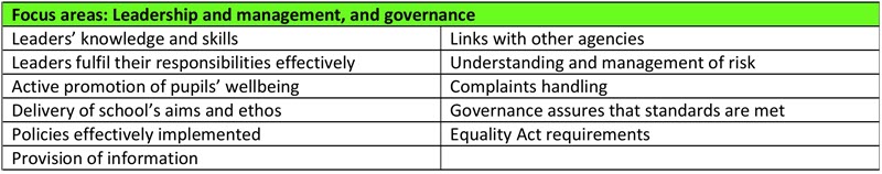 This part forms the main section of the self-evaluation process. It provides proprietor(s)/governors and leaders with a structured approach to prompt questions and focus areas for self-evaluation. This approach informs ongoing evaluation by school leaders and governors of the effective implementation of decision-making at the school, as required by relevant standards and regulations.